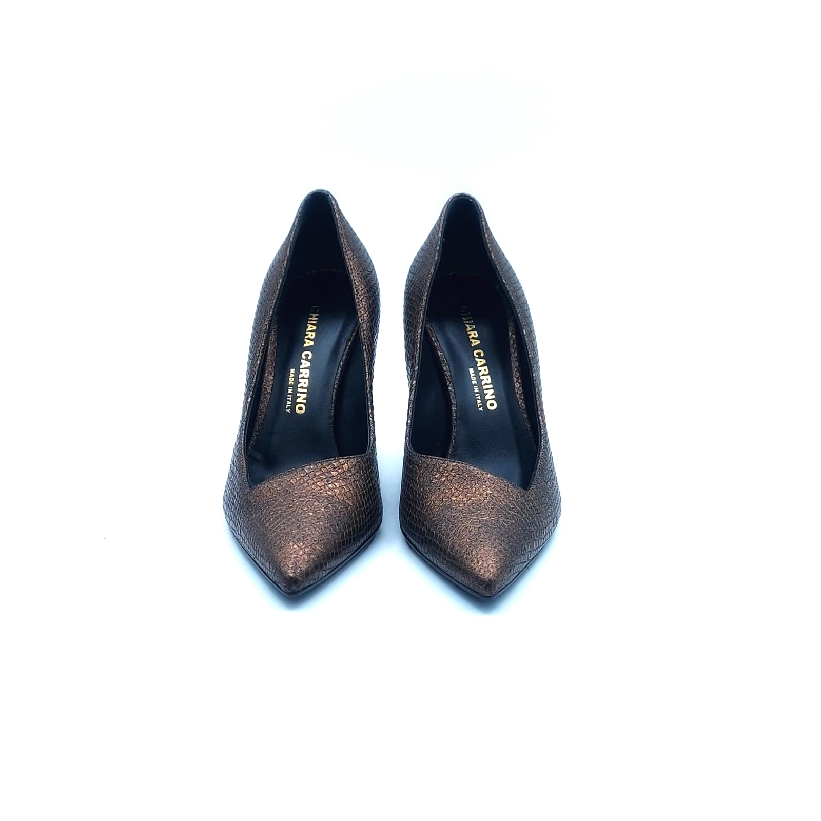 Décolleté in pelle stampato pitone bronzo dal particolare scollo asimmetrico.