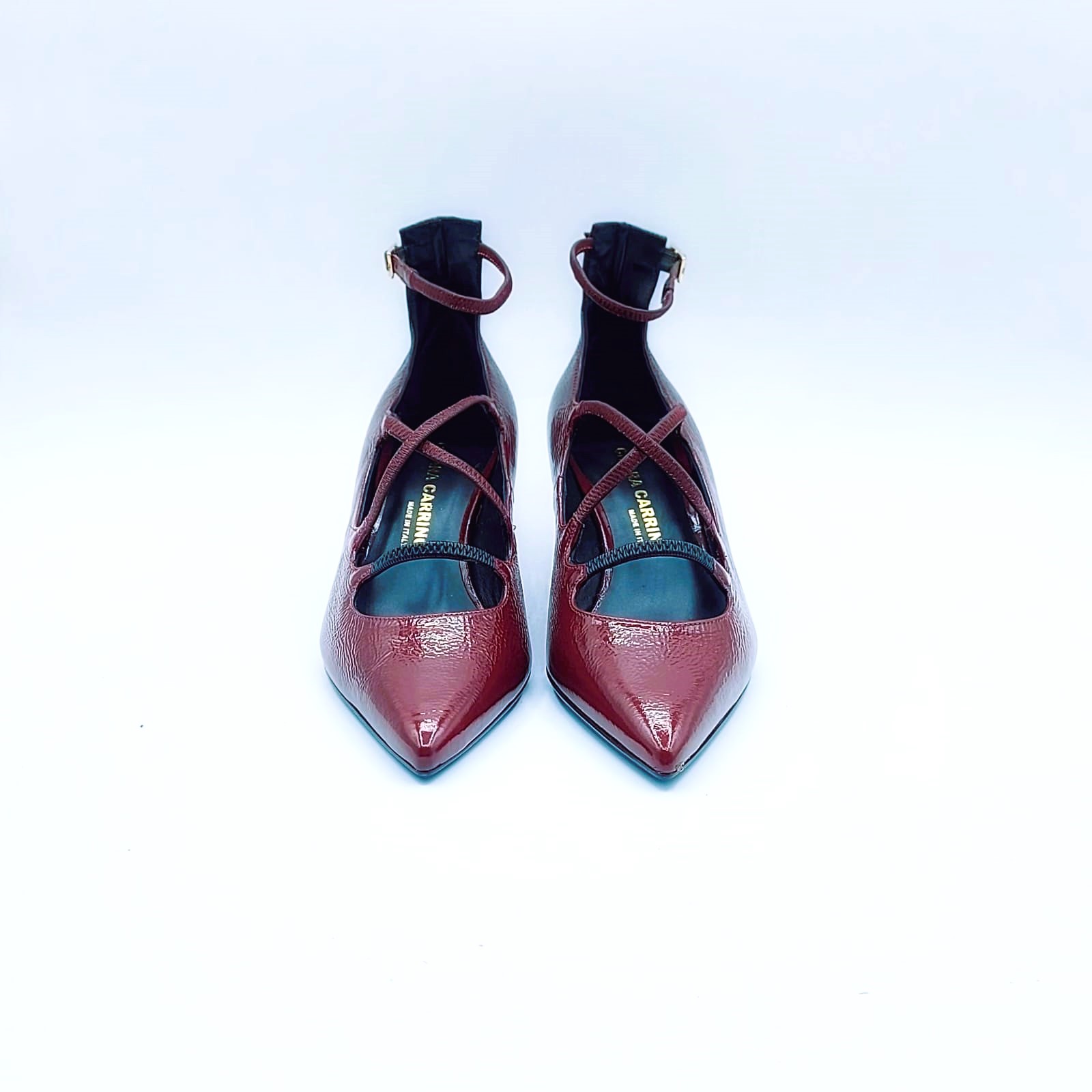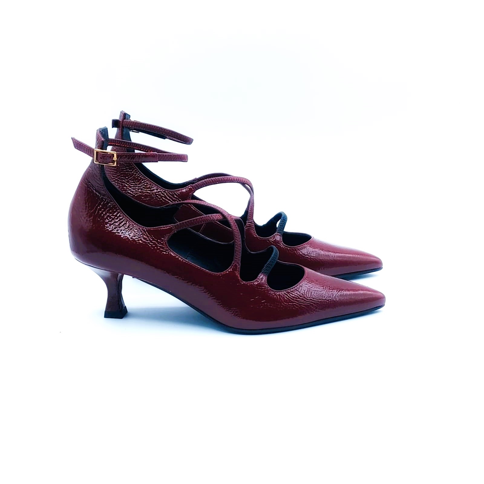 Décolleté in naplak bordeaux con incrocio di elastici e cinturino regolabile alla caviglia