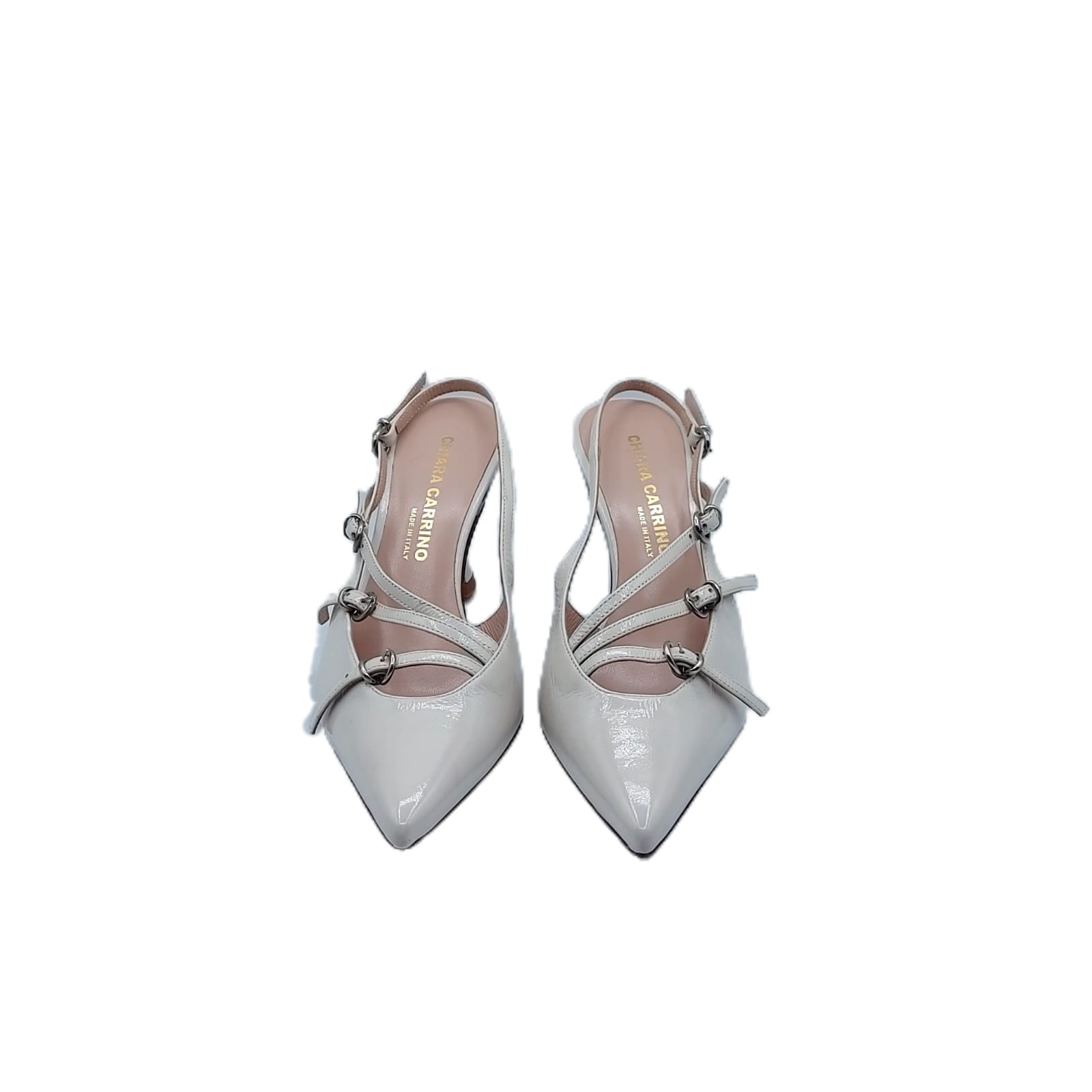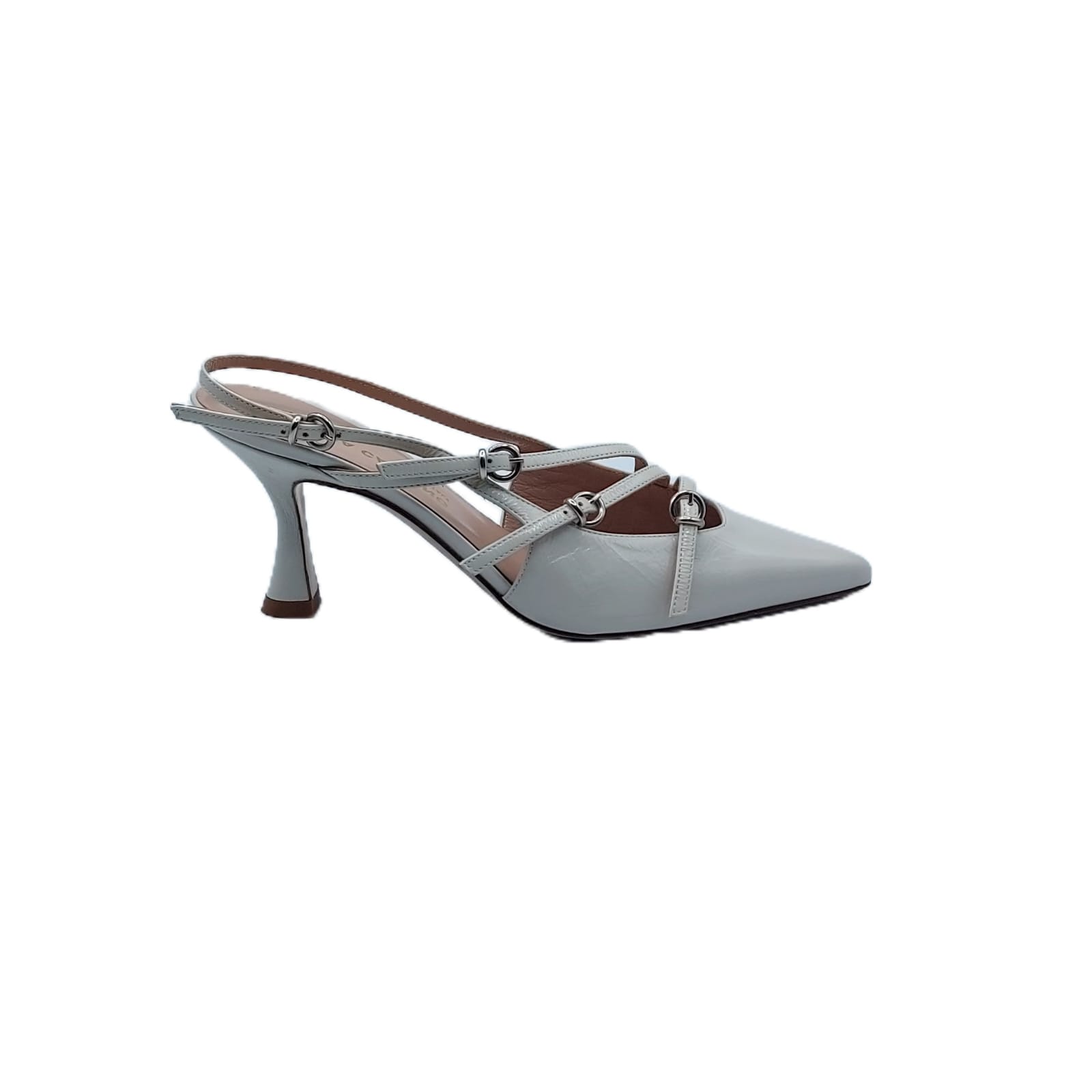 Slingback in Verlux milk. Impreziosita da cinturini laterali.