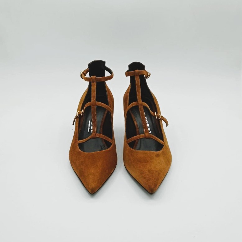 Décolleté in suede color brandy, abbellito da cinturini tono su tono.