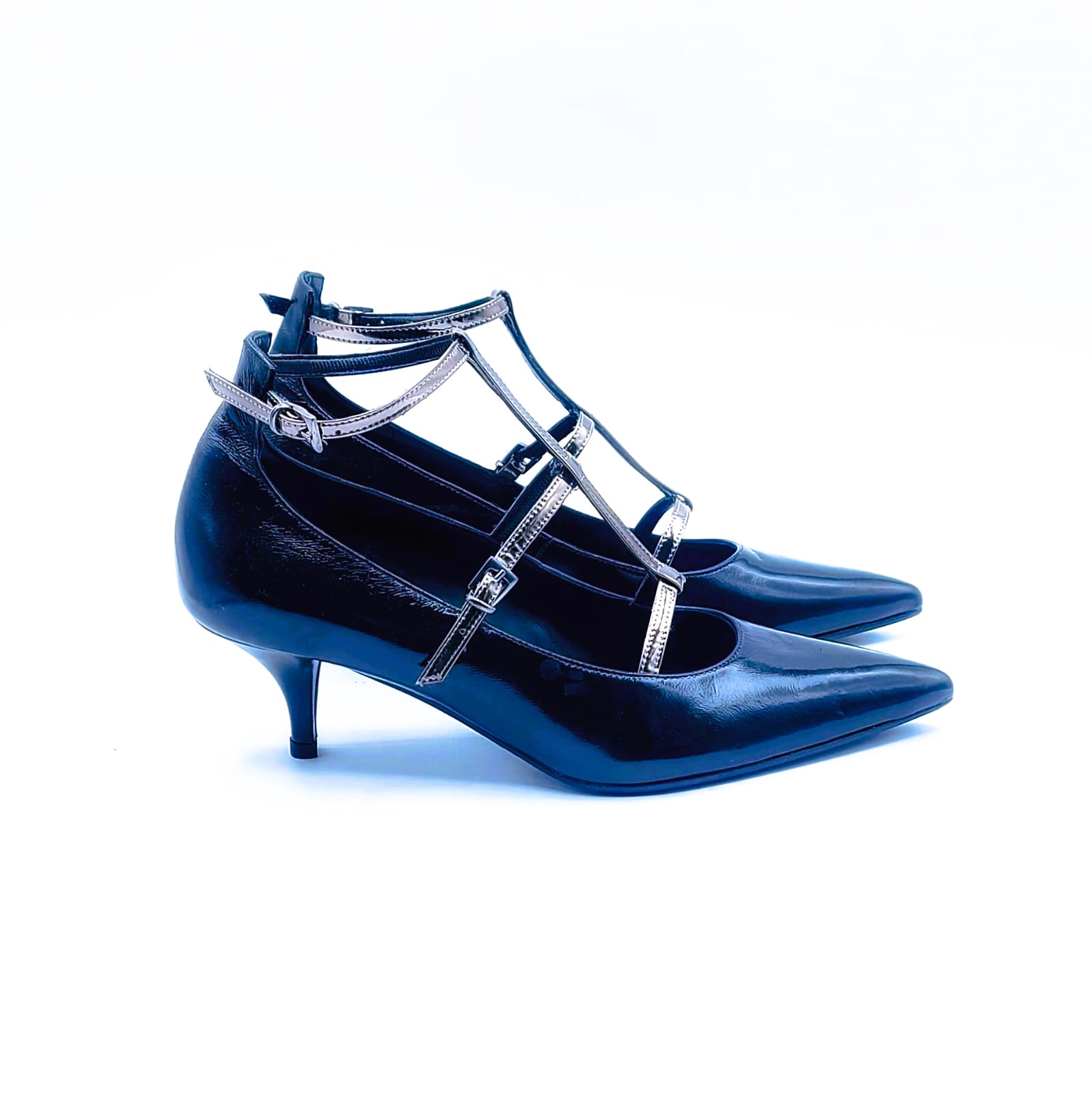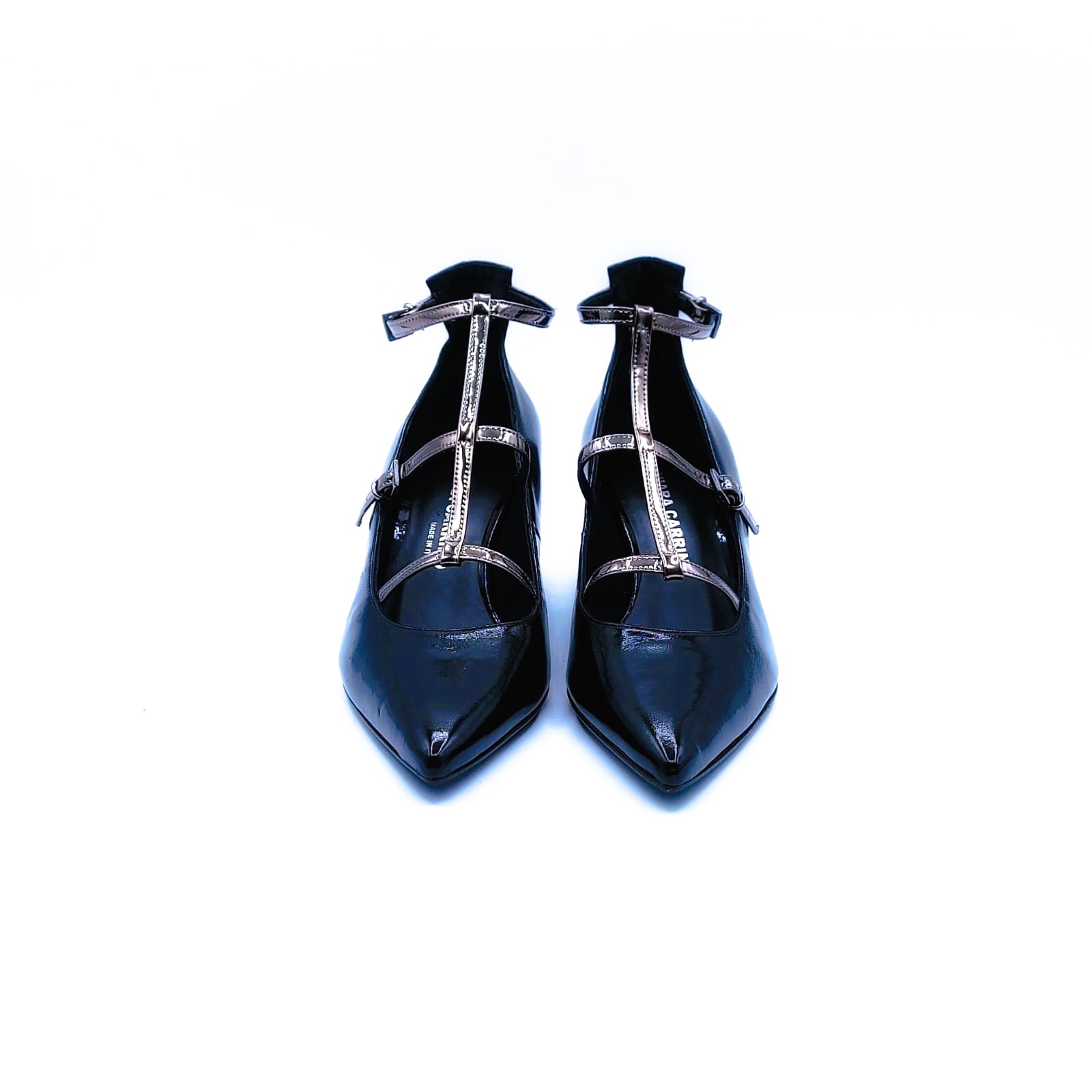 Décolleté in naplak nero, abbellito da cinturini in specchio color canna di fucile.