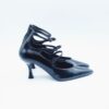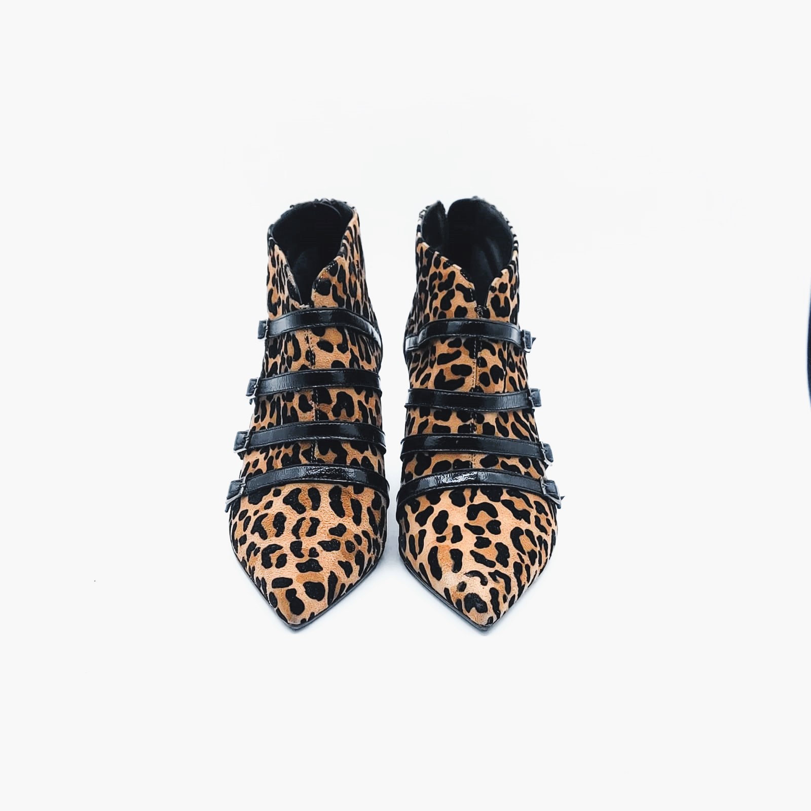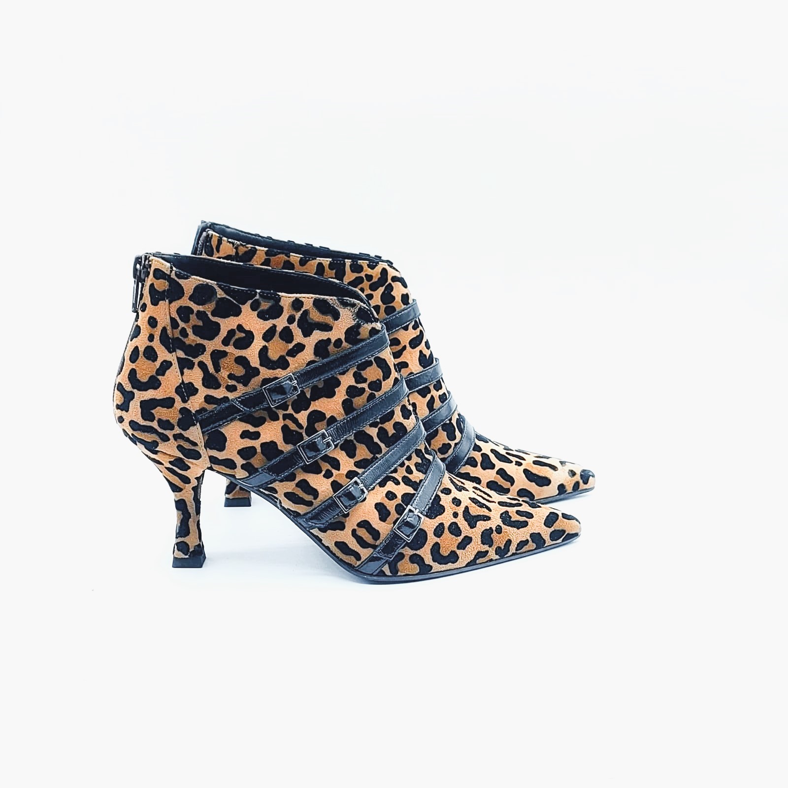 Tronchetto in suede animalier impreziosito da più cinturini neri, con chiusura zip sul tallone.